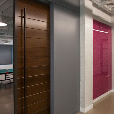 The 75,000 s.f. project features a new wood, steel and concrete staircase which allows for quick floor to floor commuting. Multiple types of meeting areas, training rooms, and casual collaboration spaces were also created along the corridors. Invigorating pops of color were added in spaces of collaboration to draw the users in from the warm neutrality of the overall space. The game room and the large open break area can accommodate moments of recreation or larger scaled meetings.