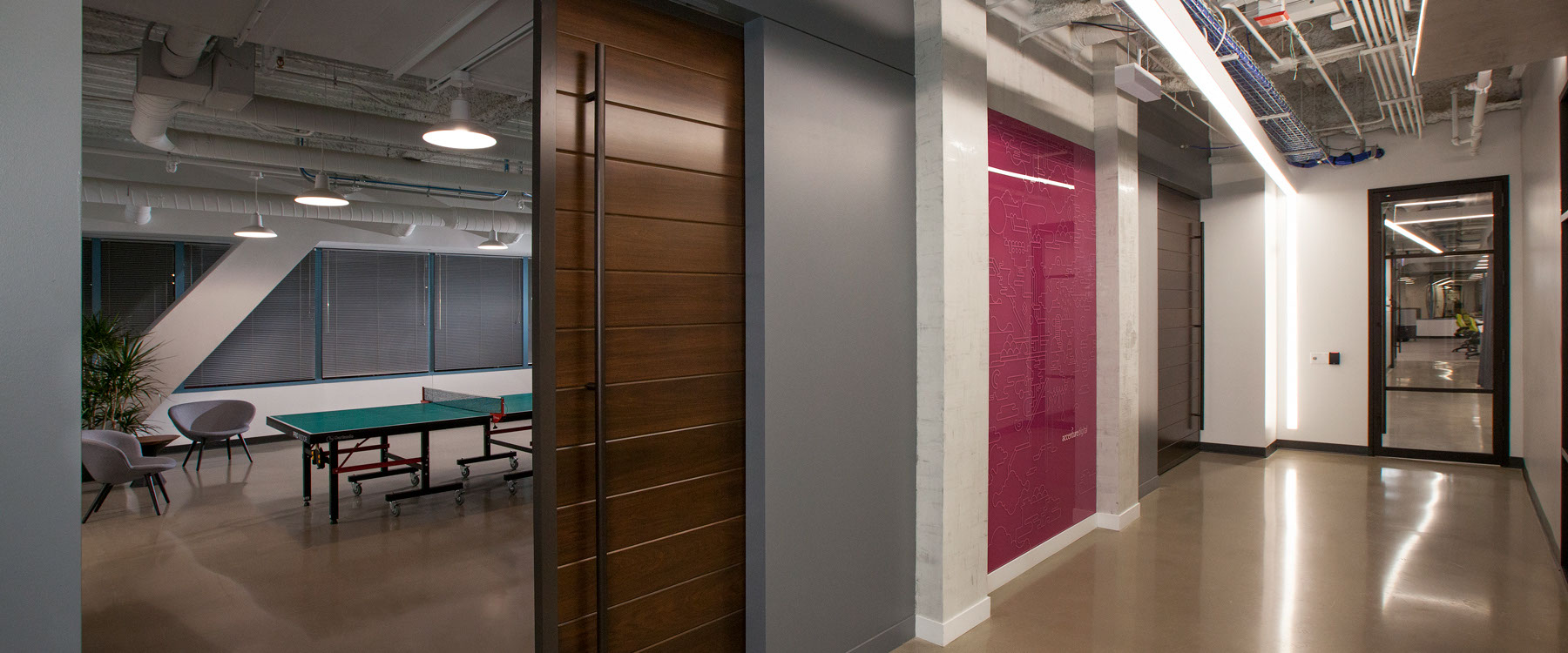 The 75,000 s.f. project features a new wood, steel and concrete staircase which allows for quick floor to floor commuting. Multiple types of meeting areas, training rooms, and casual collaboration spaces were also created along the corridors. Invigorating pops of color were added in spaces of collaboration to draw the users in from the warm neutrality of the overall space. The game room and the large open break area can accommodate moments of recreation or larger scaled meetings.