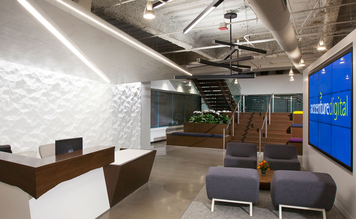 Accenture, a digital marketing and analytics company, wanted to consolidate several of its related divisions onto two floors creating a “Digital Hub”. Development Solutions, Inc. worked with Baumann Studios to create a more open and collaborative office environment.